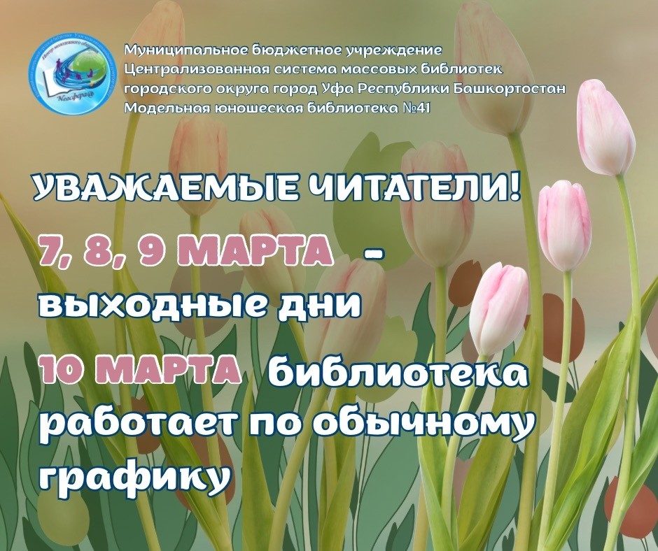 График работы библиотеки в праздничные дни, посвященные Международному женскому дню Дорогие читатели и подписчики! Обращаем ваше внимание на изменение графика работы библиотеки. 7, 8, 9 - выходные дни. 10 марта библиотека работает по обычному графику.