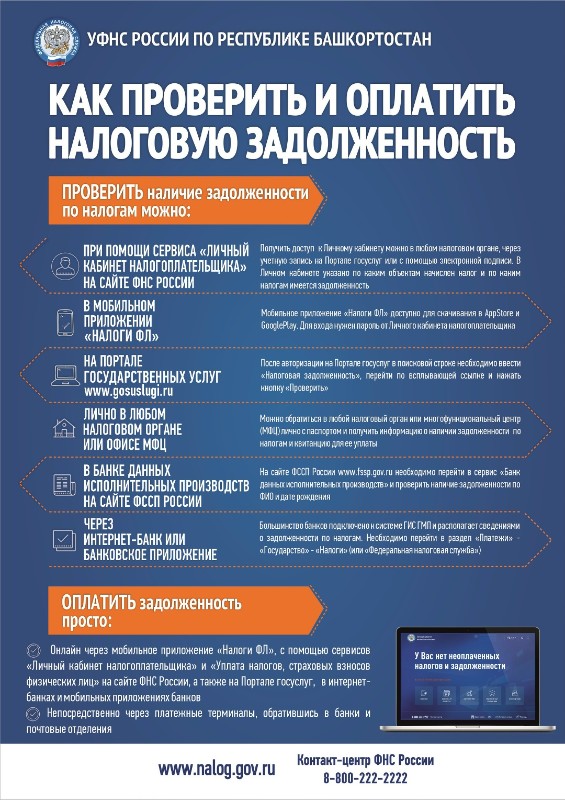 Сэкономьте время и деньги: проверьте налоговые долги прямо сейчас Каждый день просрочки - это риск: Простое решение: оплатите задолженность - и забудьте о проблемах Узнать о налоговой задолженности можно через:
